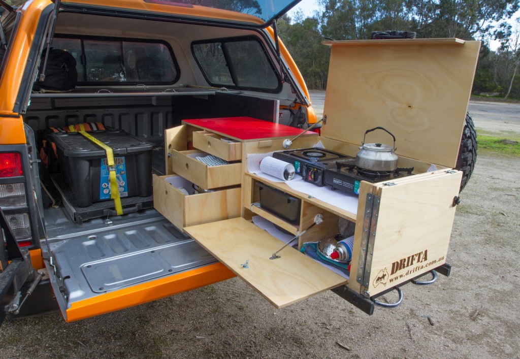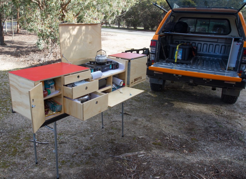 A pull-out kitchen that can fit in a dual-cab ute or a camper trailer.