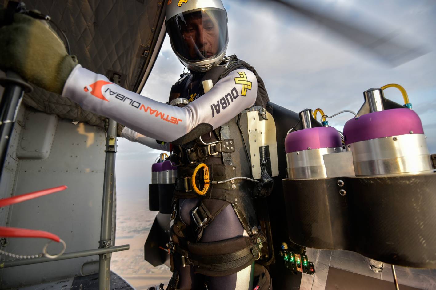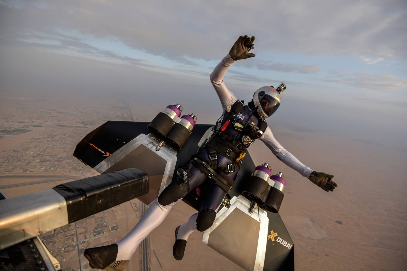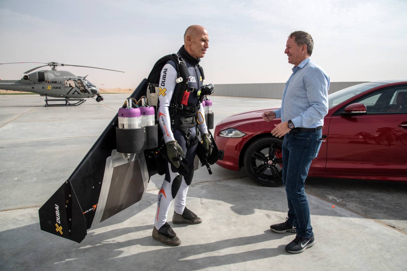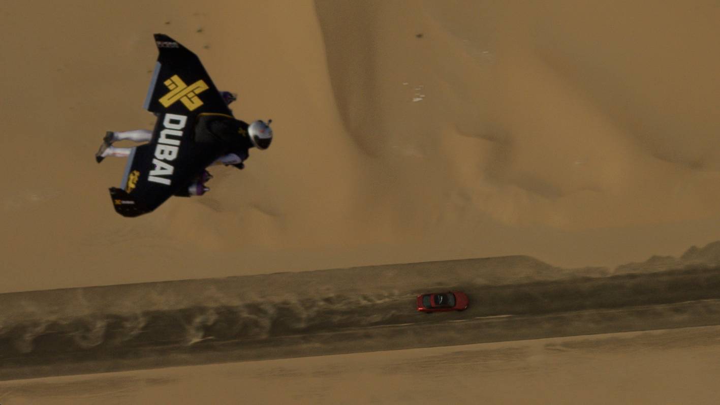IN A STUNT THAT makes the recent Lexus TV commercial look a little tame, Jaguar Land Rover pitted ex-Formula One racer, Martin Brundle, against Jetman Dubai pilot, Yves Rossy in a race “deep in the Dubai desert”. Yep, a bloke with jets strapped to his back, being dropped out of a helicopter to race a car, what could possibly go wrong? Nothing actually.
