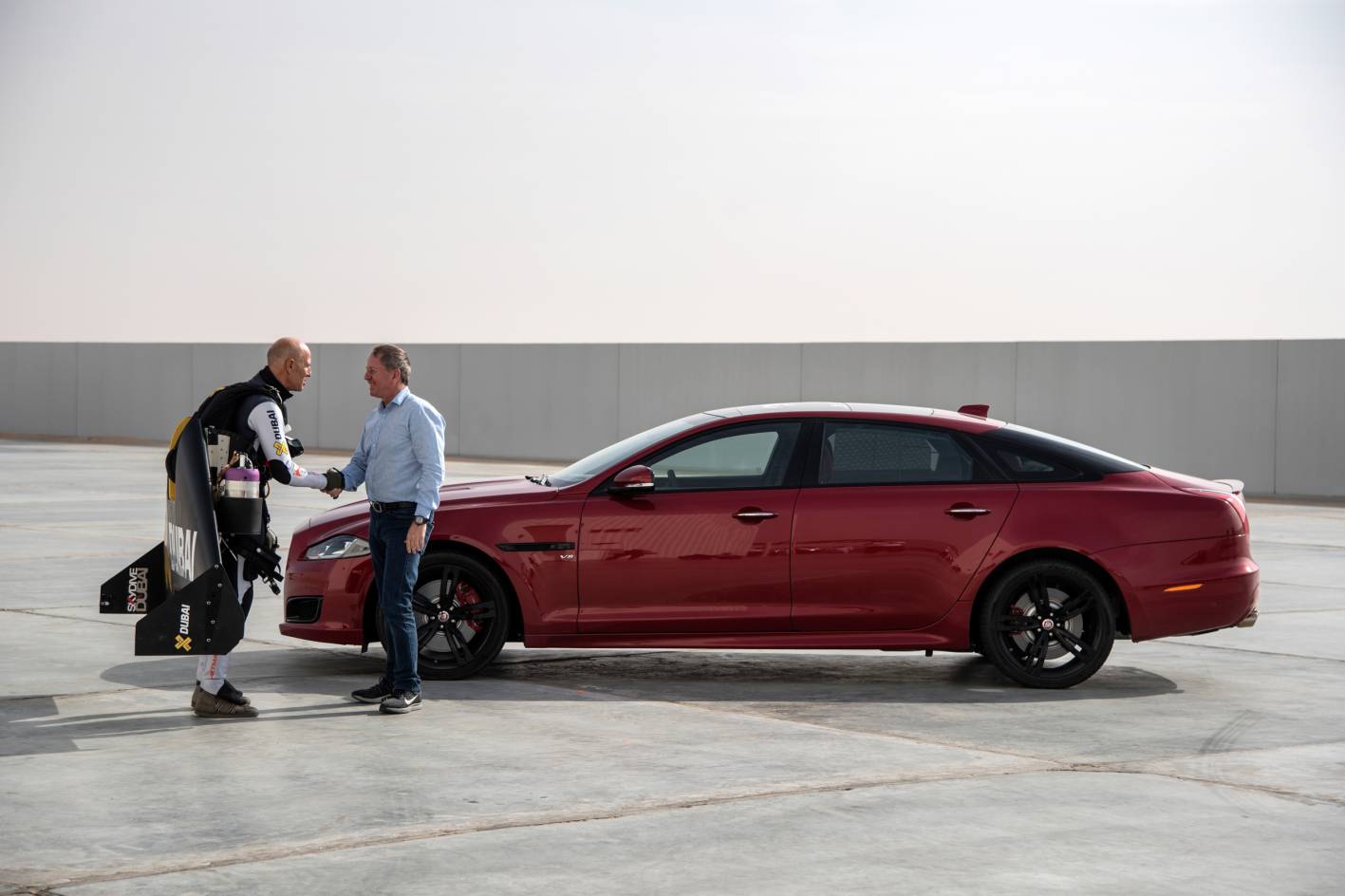 Ex-Formula One racer, Martin Brundle, driving a Jaguar XJR went head-to-head with self-proclaimed Jetman Dubai pilot, Yves Rossy…