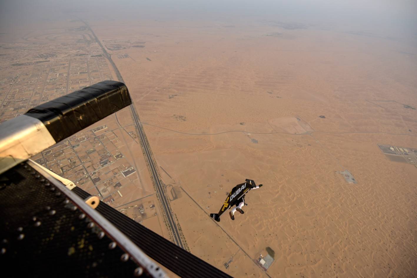 After five seconds of free-fall following his jump from the “Jetman launch helicopter”, Rossy was able to level off and power through the sky above the car, reaching a top speed of more than 300km/h before he flew over the line.