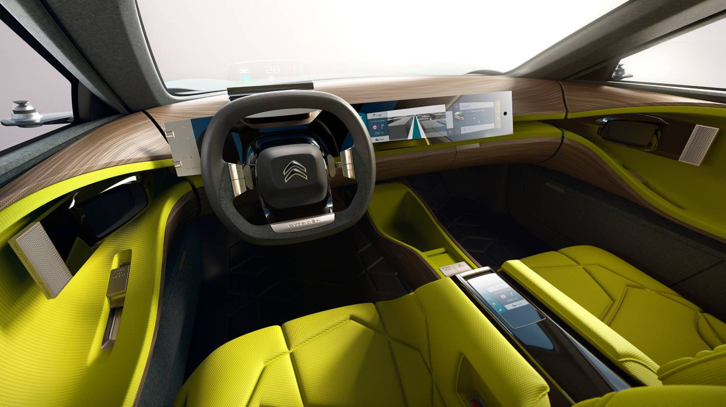 “The single-spoke steering wheel gives a nod to the brand’s history and the floating dashboard is a horizontal design with a three-dimensional appearance featuring a sculpted, tubular cut-out flowing in a single piece from the right rear door to the left rear door,” Citroen said.