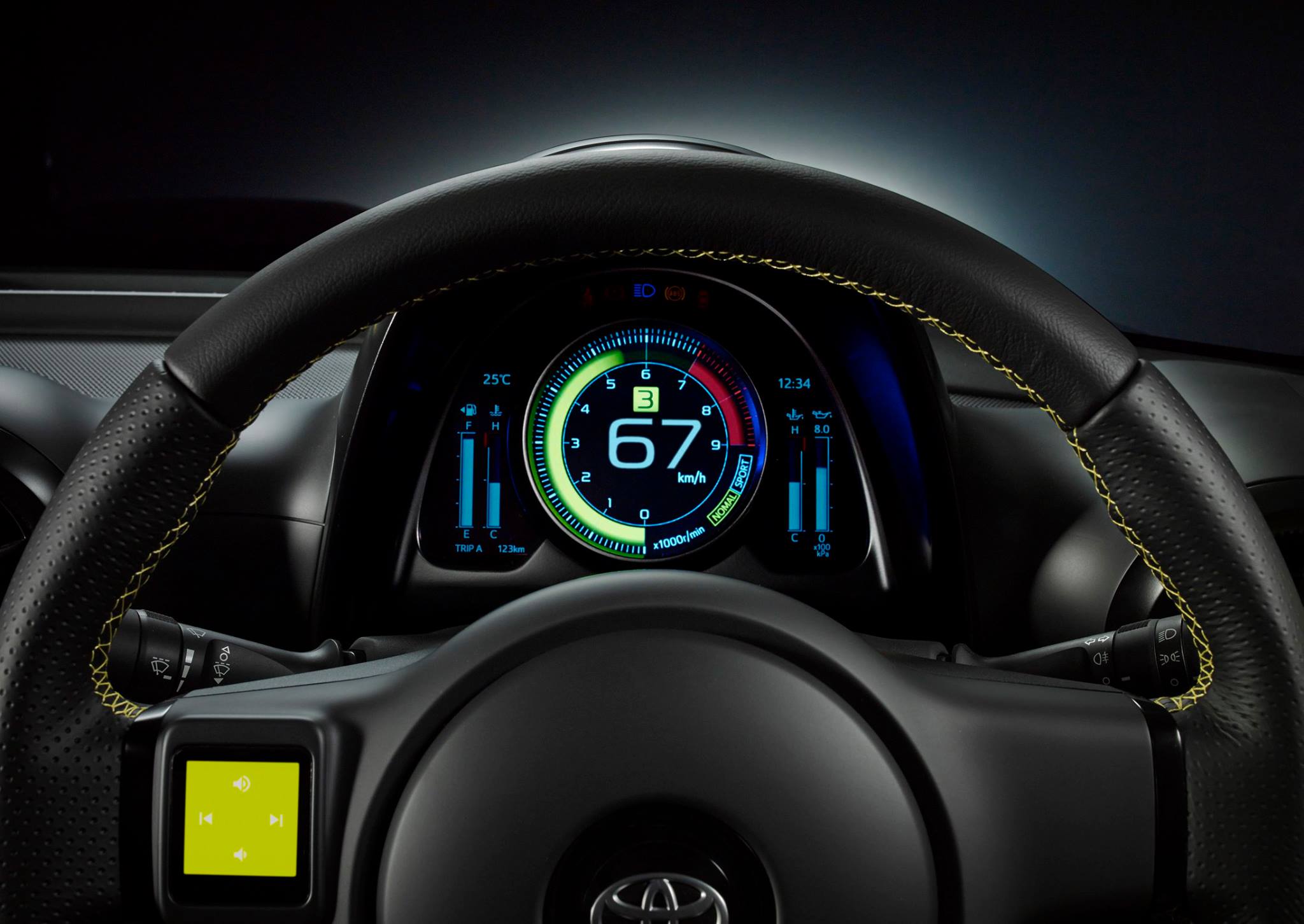 The steering wheel looks familiar to 86 owners, but the addition of steering wheel controls is new. Toyota made a point of not placing any controls on the 86’s steering wheel, which as an owner never bothers me in the slightest.  The 86 also had the smallest steering wheel ever fitted to a Toyota, but perhaps the S-FR will be smaller again.  The buttons are volume up/down, and left-right select.