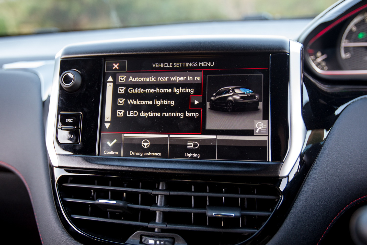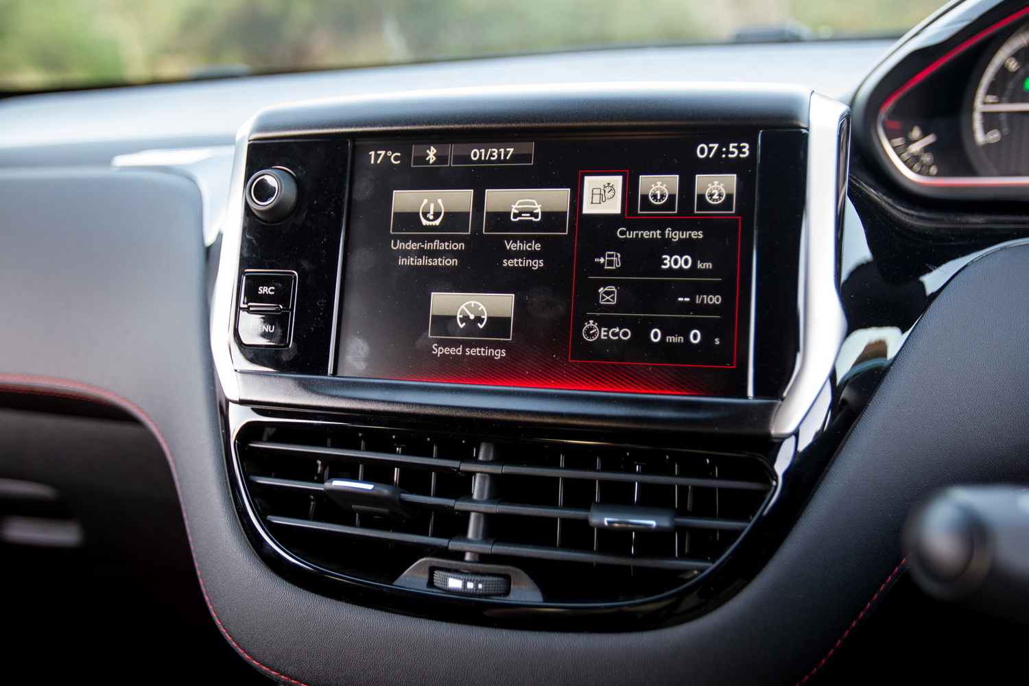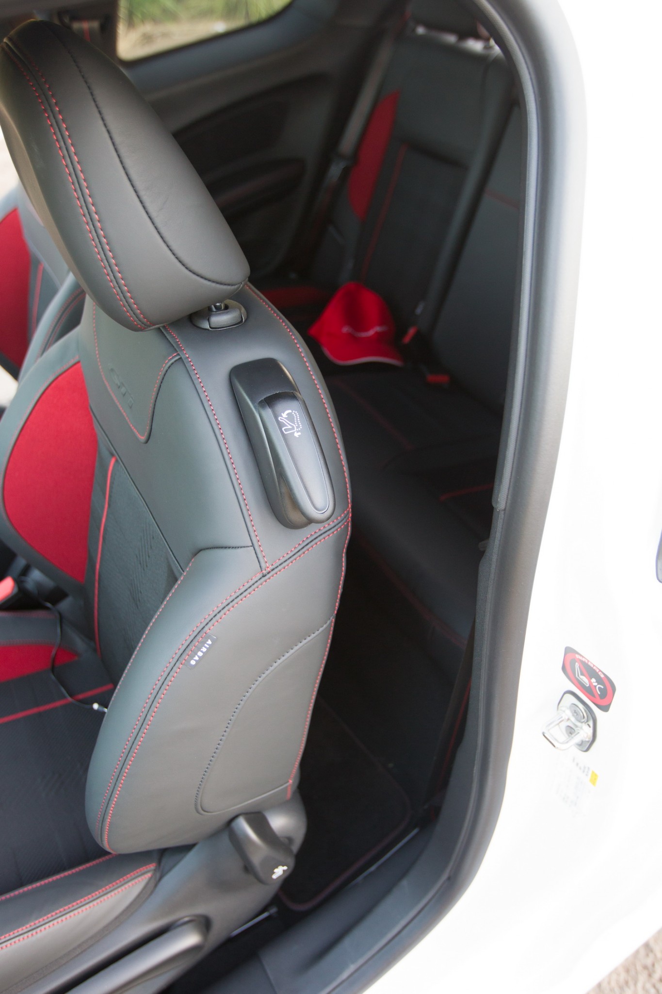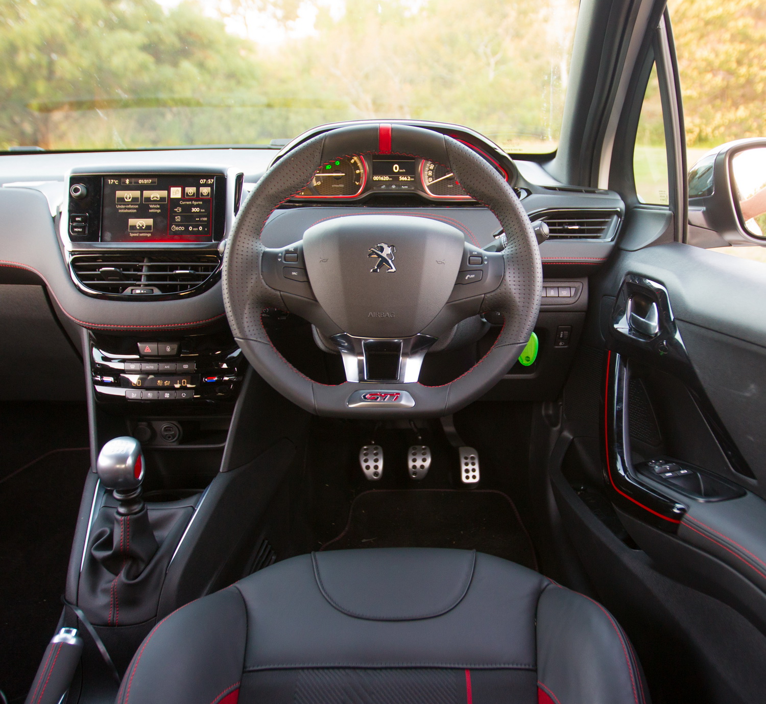 The interior of the 208 GTi is a delight. It’s all nicely swooping curves, matched colours and high quality, an interior that pleases the eye. The controls are odd if you’re coming from a Japanese background, but easy to get used to. The infotainment unit is very good, quick to respond, clear, includes sat-nav and has useful functions. The steering wheel has a GTi badge, because there aren’t enough on the car already, and has the pointless flat-bottom and centre mark.