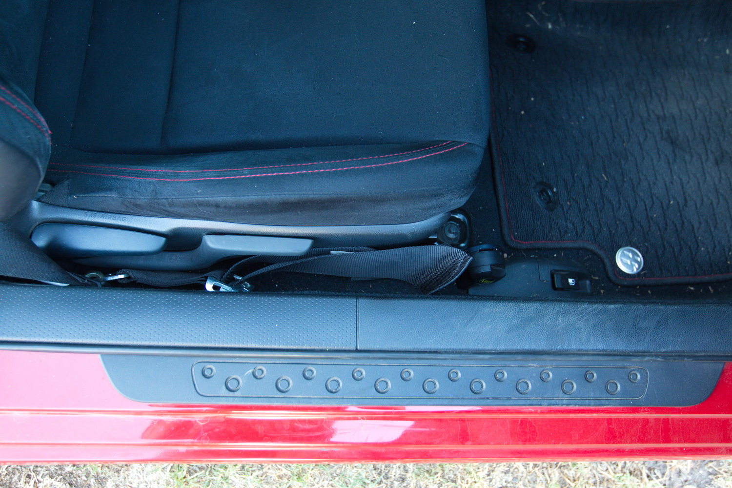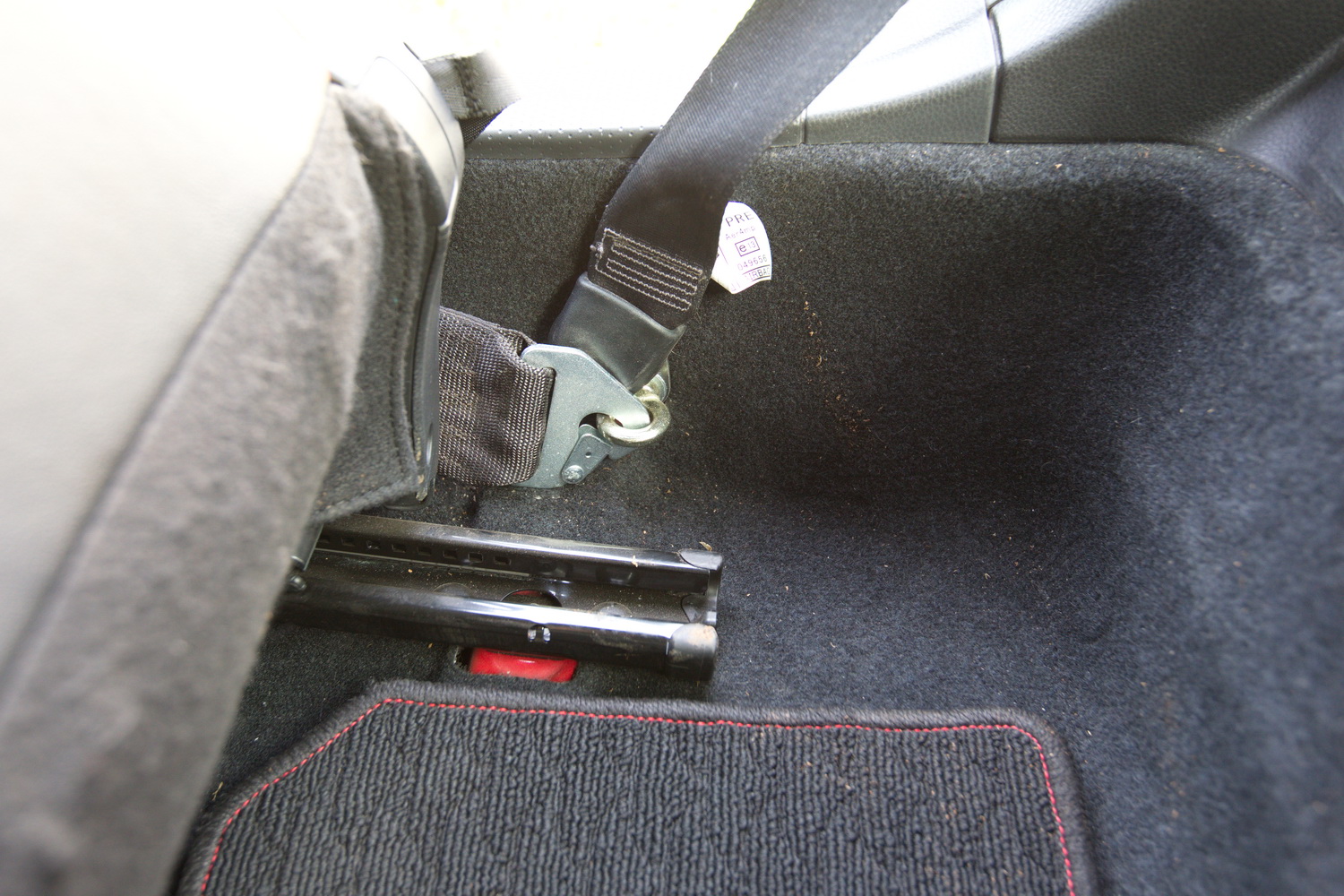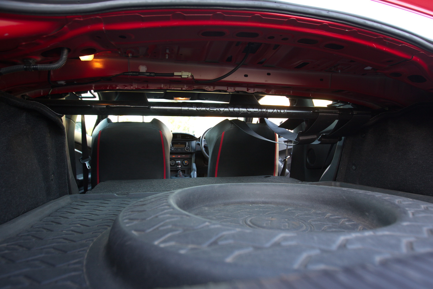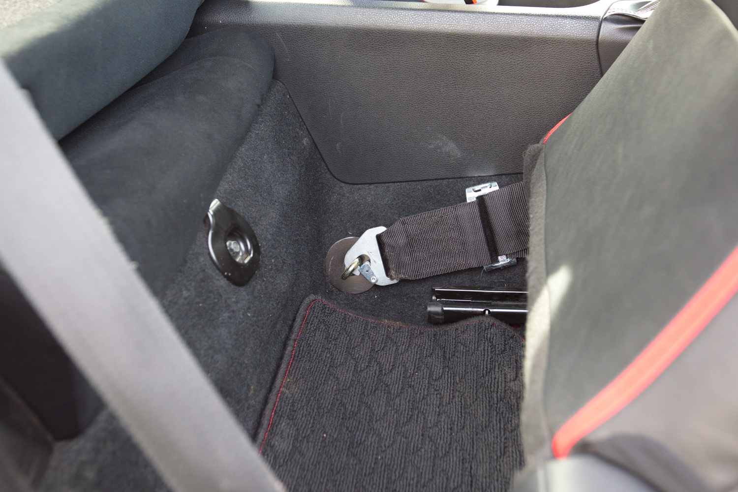 When not in use, the straps are folded away in the boot, and the factory seatbelt – which is entirely untouched – is used instead. The bar doesn’t really intrude on interior space, and it is still possible to slide a 215 section wheel under it to be stored behind the rear seats.